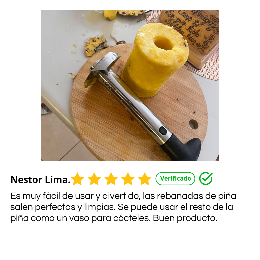 Nuestro Cortapiña© hace el trabajo por ti: fácil, rápido y sin complicaciones. Transforma la tediosa tarea de preparar una piña en un proceso limpio y eficiente, para que disfrutes de esta deliciosa fruta en cualquier momento.
